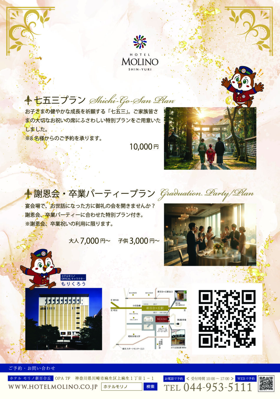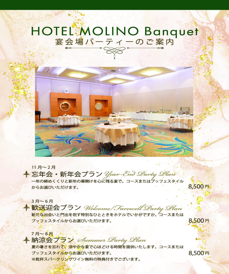 TEL:044-953-5111(ホテル代表)10:30~17:00 mail:banquet@hotelmolino.co.jp